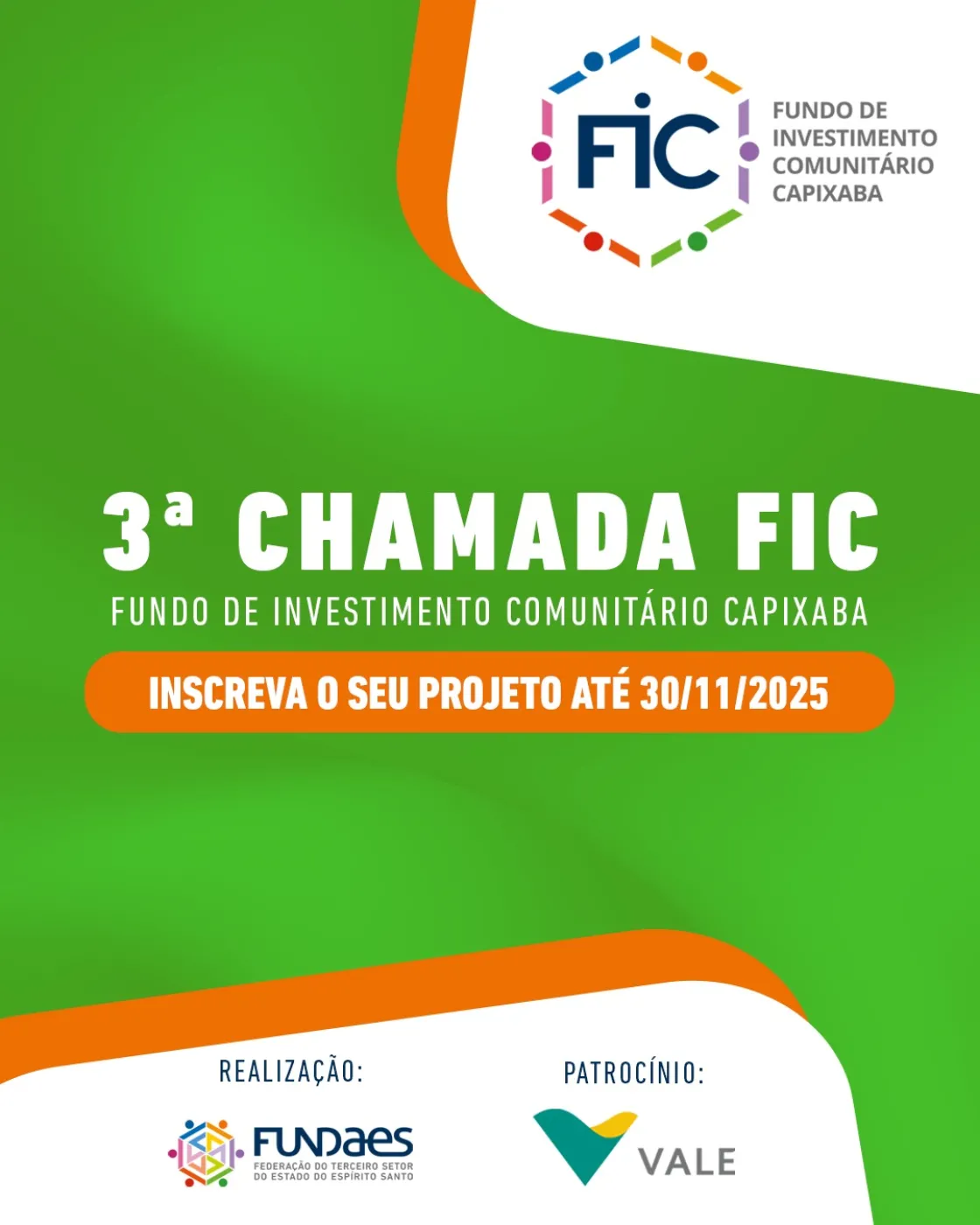 A FUNDAES, em parceria com a VALE, convida iniciativas, organizações, coletivos e projetos sociais do Espírito Santo a se inscreverem na 3ª Chamada do FIC – Fundo de Investimento Comunitário Capixaba, realizada nessa edição com recursos doados pela Vale.