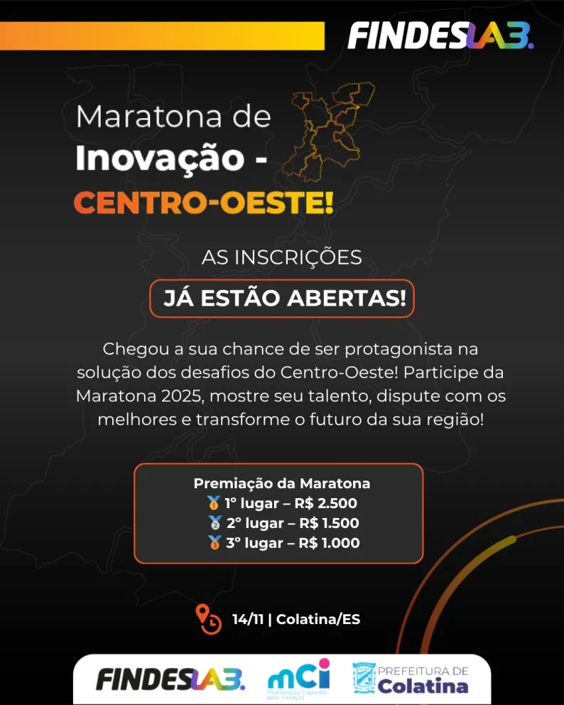 A Maratona de Inovação Centro-Oeste, executada pelo Findeslab, em parceria com a Prefeitura Municipal de Colatina, Prefeitura Municipal de Baixo Guandu, Prefeitura Municipal de Marilândia e a Mobilização Capixaba pela Inovação (MCI) surge como uma iniciativa estratégica para fomentar a criação de soluções inovadoras que atendam às demandas locais, estimulando o pensamento criativo, o trabalho colaborativo e a integração de diferentes áreas do conhecimento.