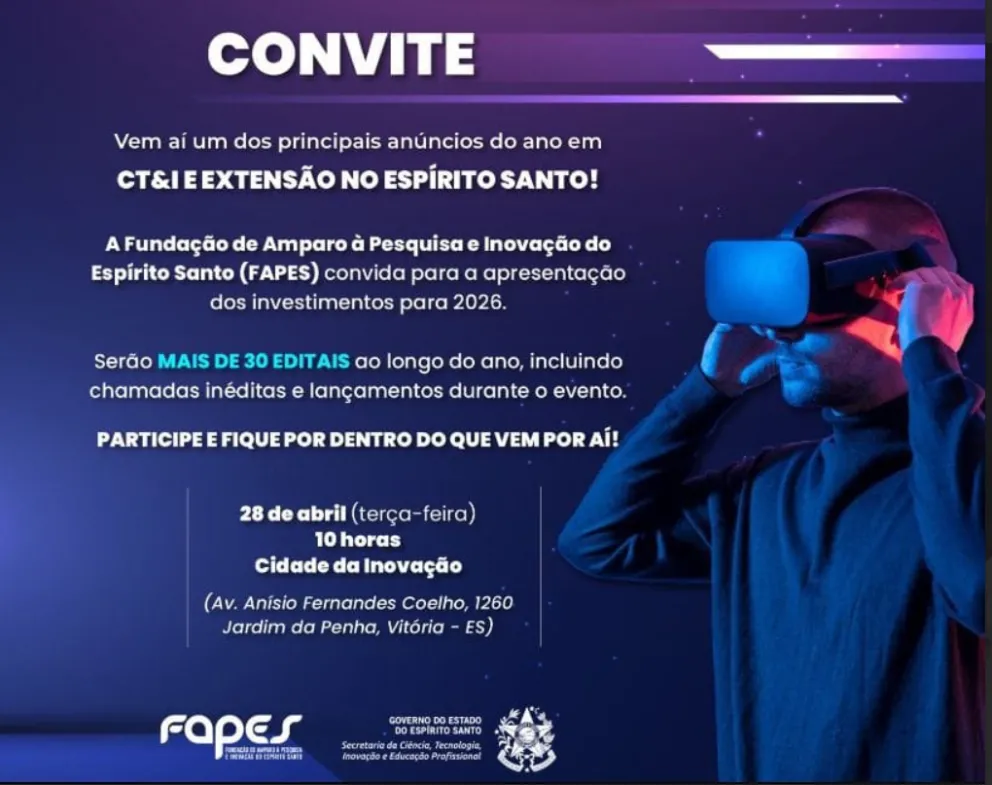 Se você atua com inovação, pesquisa ou extensão, esse é um evento que merece sua atenção. A FAPES (Fundação de Amparo à Pesquisa e Inovação do Espírito Santo) realizará a apresentação oficial dos investimentos previstos para 2026, trazendo uma visão estratégica das oportunidades que serão abertas ao longo do ano. |