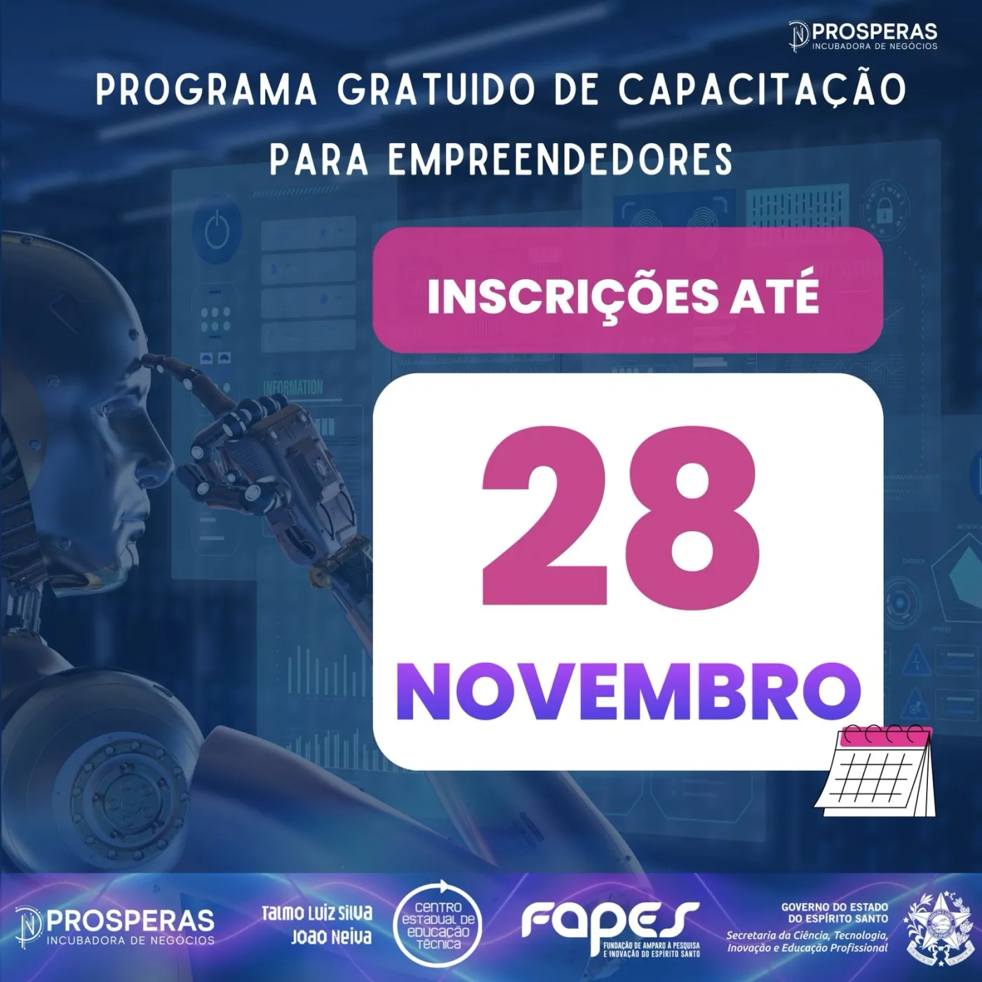 Bom dia! Lembramos que nosso edital de incubação está aberto e as inscrições vão até 28 de novembro. Temos 4 vagas presenciais e 4 vagas online — então vamos divulgar com o pessoal aí da região! 🚀