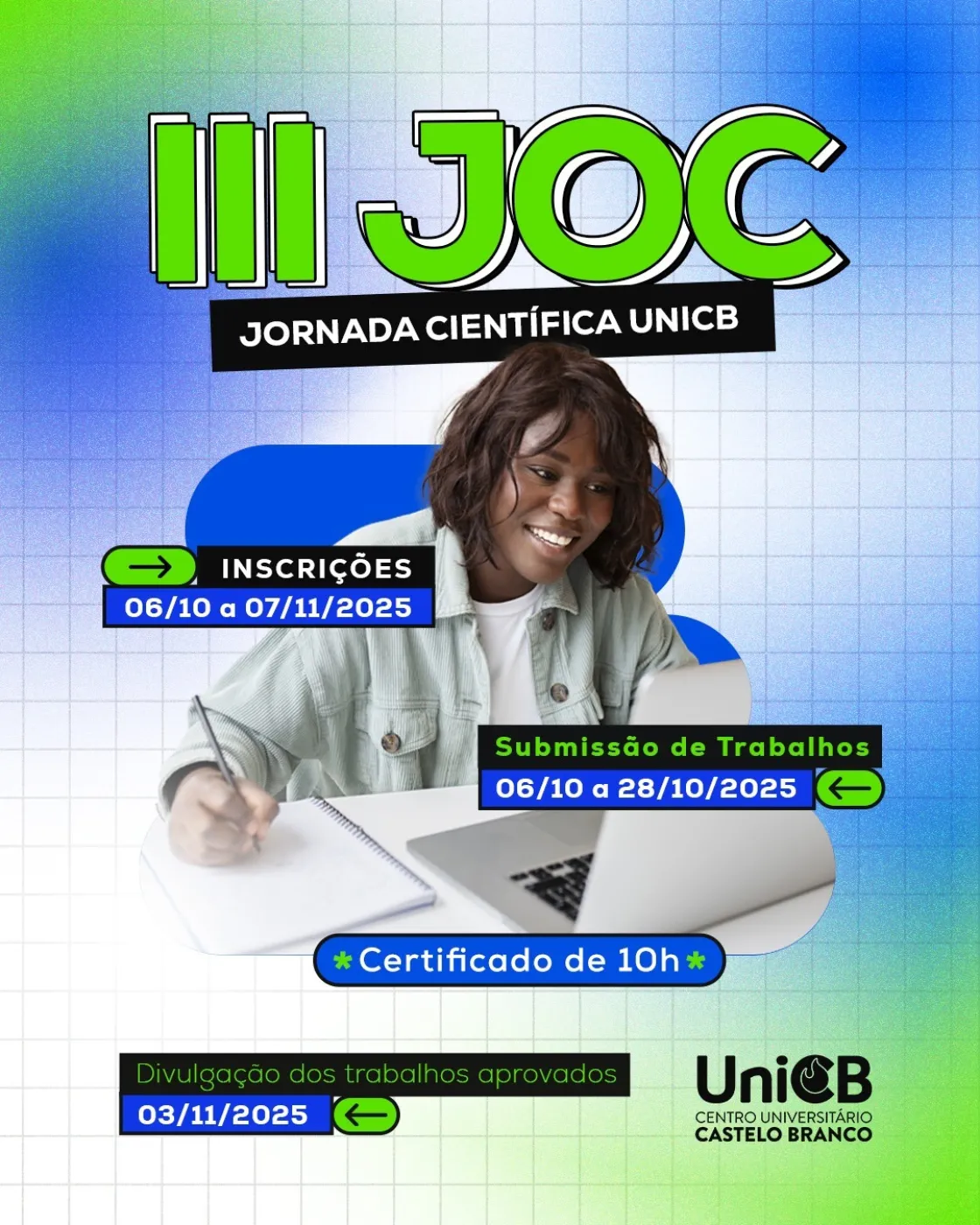 Compartilho a arte oficial da III JOC – Jornada Acadêmica e Científica do UniCB. A comunidade acadêmica e externa pode submeter trabalhos e também participar como visitante no dia do evento.