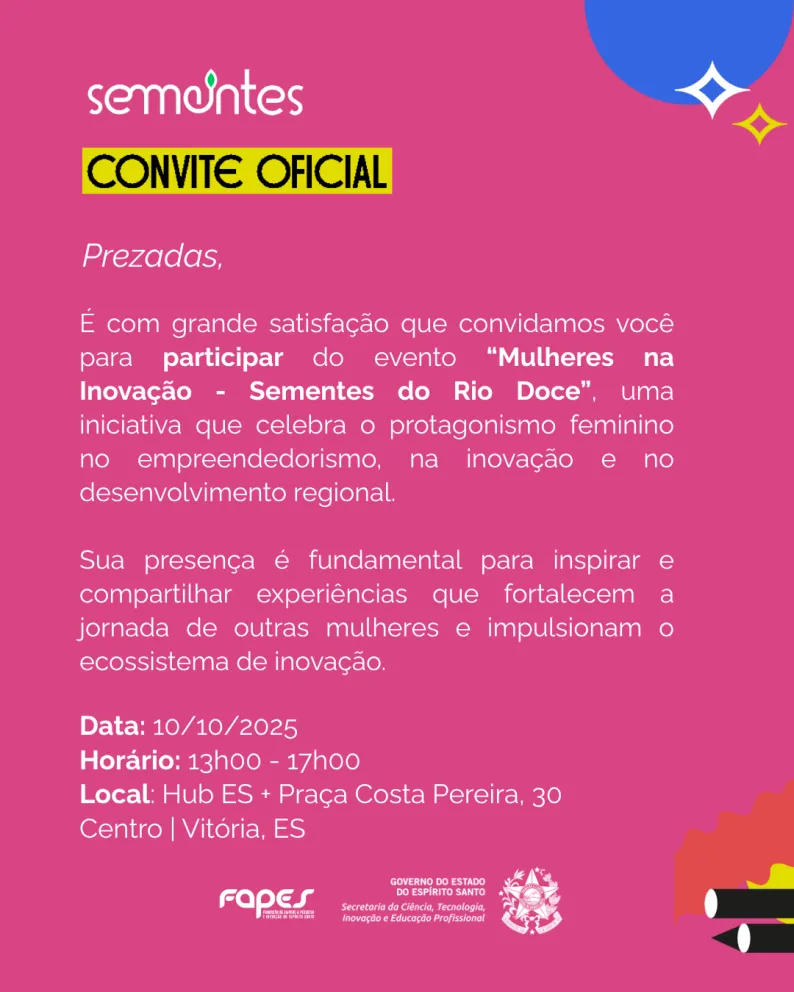 *Link para inscrição: https://www.sympla.com.br/evento/inovadoras-mulheres-na-inovacao-sementes-do-rio-doce/3142678*