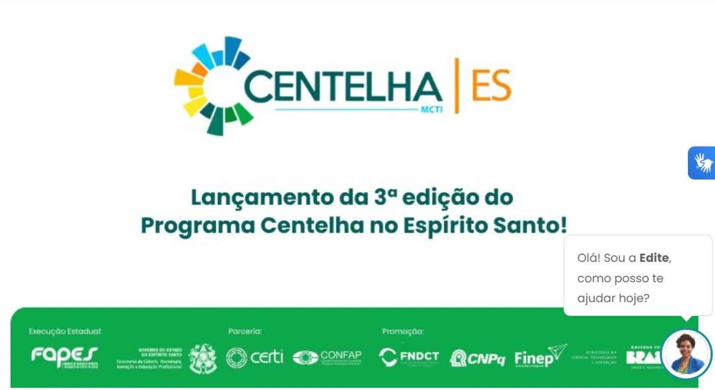 O Governo do Estado, por meio da Fundação de Amparo à Pesquisa e Inovação do Espírito Santo (FAPES), lança na próxima terça-feira (07), às 10h, no Palácio Anchieta, em Vitória, a 3ª edição do Programa Centelha-ES – já com inscrições abertas para seleção de ideias inovadoras de capixabas que sonham em empreender.