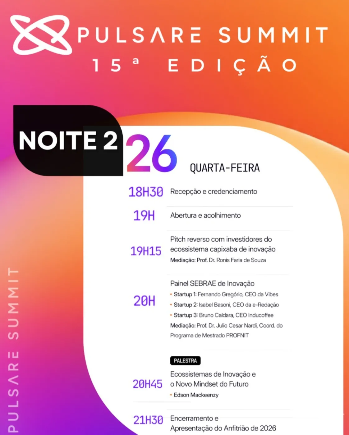 A segunda noite do Pulsare Summit está chegando com ainda mais conexões, inovação e histórias que celebram os 15 anos do movimento que transformou Colatina em um polo de criatividade e tecnologia.