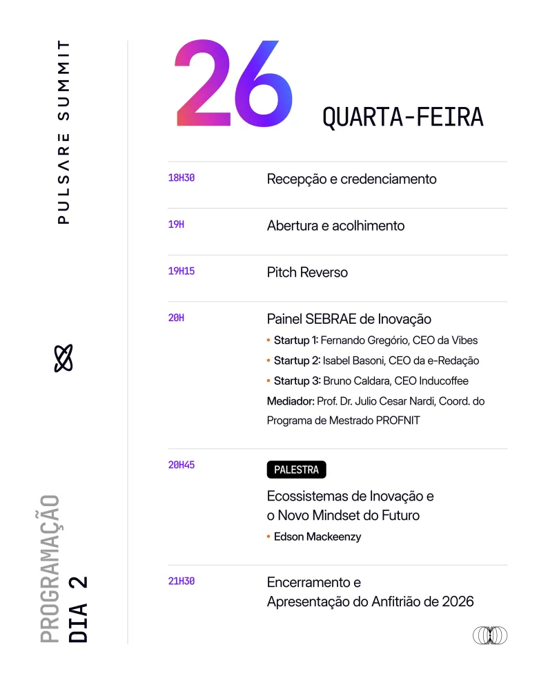 No dia 26, a programação traz o Pitch Reverso, o Painel SEBRAE de Inovação com startups convidadas e a palestra de Edson Mackeenzy, referência nacional em empreendedorismo e inovação, com o tema “Ecossistemas de Inovação e o Novo Mindset do Futuro”.