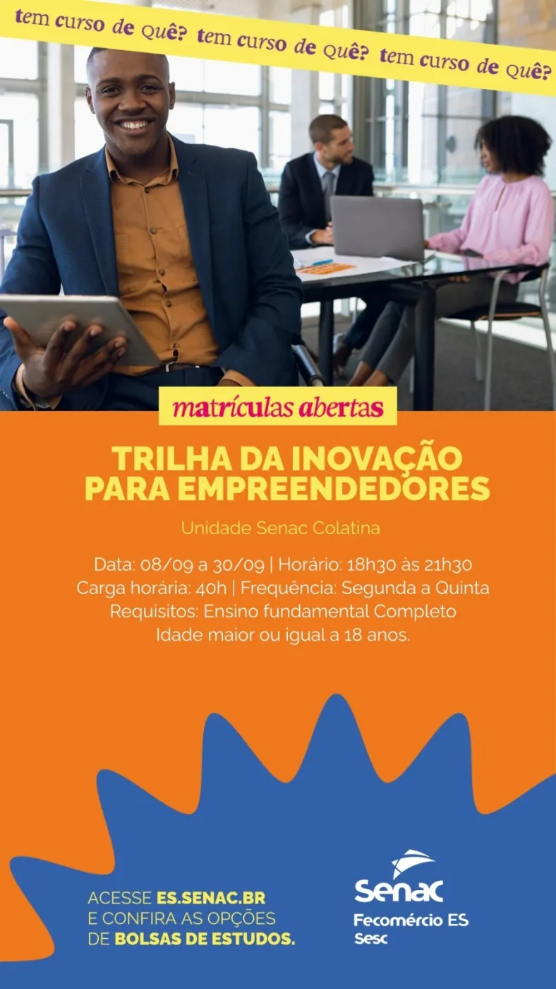 O Senac Colatina está com inscrições abertas para o curso Trilha da Inovação para Empreendedores.